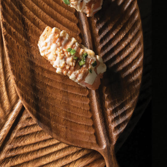 Babhla déanta as adhmad cnó dorcha le duilleoga